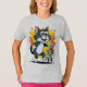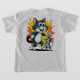 Spaß Cartoon T - Shirt Design mit einer spielerischen Katze, die eine Maus mit Käse jagt. Helle Farben, Comic-Explosion-Hintergrund und dynamischer Kunststil machen es zum idealen Ort für lässige Beanspruchung.