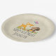 Personalisierte Geburtstagspapier-Teller mit einer niedlichen Abbildung mit einem Hirsch und einem kleinen Eichhörnchen, das eine Eichel und einen Schmetterling über ihren Köpfen hält. Diese bezaubernden Waldkreaturen auf einem Gras stehend, mit einigen skurrilen Pilzen an den Füßen. Hintergrund hat einen braunen Kraftpapier-Look.