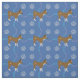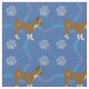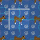 Chihuahua steht im niedlichen Cartoon-Stil vor einem blauen Hintergrund mit Pfotendrucken und Spuren in Grau, Rosa und Blau.