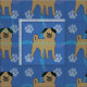 Dieser lustige, niedliche Mops im Cartoon-Stil steht mit einem Lächeln vor blauem Hintergrund mit Pfotenabzügen und Tracks in Grau, Rosa und Blau. Design von Diane Blackman. Das gleiche Design ist auch bei anderen lustigen Hundebildern erhältlich.