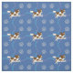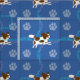 Papillon im Stil eines Cartoon, der vor einem blauen Hintergrund mit Pfotendrucken und Spuren in Grau, Rosa und Blau spitzt.