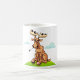 Dieses Design ist ein Cartoon Elch. Der Elch sitzt auf einem Gras mit einem Stück Gras im Mund. Dieses Cartoon Elch Design sieht auf dieser Tasse großartig aus