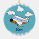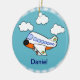 Adorable Cartoon Flugzeug fliegt durch den blauen Himmel und Wolken. Auf einem sonnendurchfluteten Hintergrund in blau