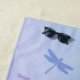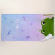 Ein niedlicher Frosch mit großen Augen guckt durch das große, weiße Gras auf einem Feld auf diesem lustigen und skurrilen Strandtuch. Hübsche Libellen unterschiedlicher Größe fliegen über dem Froschkopf gegen einen blauen / rosa Himmel - personalisieren Sie mit ihrem Namen - durch katz_d_zynes