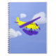 Notebook mit einem blau-blauen und weißgelben Flugzeug, das im bewölkten Himmel fliegt, mit Baupapier erstellt und in Fotoshop von KLeighE von Hinterland Harmonys Whimsical Cartoon Art ™ manipuliert