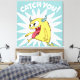 Gelbes Monster mit kleinen Hörnern, einem großen offenen Mund und einer großen Zunge, die mit dem lustigen Text "Catch You" auf hellblauem Hintergrund vorwärts läuft. Perfekte Kinderillustrierung für Kinderbekleidung, Kinderzimmer-Wandkunst, spielerische Schreibwaren, Aufkleber und lustige Charakterdesigns, die Spaß und Freude vermitteln.