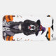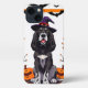 Cartoon Hund sitzt stolz und trägt einen lila Hexenhut mit einer orangefarbenen Band. Der Hund hat einen glänzenden schwarz-weißen Mantel mit hellen Augen und einem freundlichen Ausdruck.