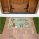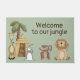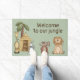 Humorvolle Vordertür-Matte mit Dschungelmotiv aus Schiefer in Grün, mit Cartoon-Grafik einer Grashütte mit Palmen, Giraffe, Zitrone, Affe und Löwe. Willkommen in unserem Dschungel in braunem Text kann personalisiert sein, zu lesen, was Sie gewollt.