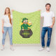 Fleece Blanket mit einer Illustration eines lächelnden Kobold, der einen grünen Anzug trägt, eine Bogen-Krawatte und einen Bowlermütze, während er in einem Topf oder Gold sitzt und einen Pint Bier mit gelbem, grünem und orangefarbenem Regenbogen im Hintergrund hält. Das Bild wird auf einem nahtlosen, hellgrünen Hintergrund mit Kleeblättern platziert. Ein perfektes Design, um den St. Patrick's Day zu feiern!