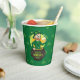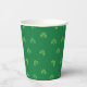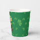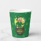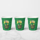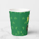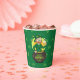 Papier-Cups mit einer Illustration eines lächelnden Kobold, der einen grünen Anzug, eine Bogen-Krawatte und einen Bowlerhut trägt, während er in einem Topf oder einem Bierchen sitzt und im Hintergrund einen gelben, grünen und orangefarbenen Regenbogen hält. Das Bild wird auf einem nahtlosen dunkelgrünen Hintergrund mit Kleeblättern platziert. Ein perfektes Design, um den St. Patrick's Day zu feiern!