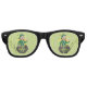 Party-Sonnenbrille mit Illustration eines lächelnden Kobold, der einen grünen Anzug trägt, eine Bogen-Krawatte und einen Bowlerhut, während er in einem Topf oder Gold sitzt und einen kleinen Bierpint mit gelbem, grünem und orangefarbenem Regenbogen im Hintergrund hält. Das Bild wird auf einem nahtlosen, hellgrünen Hintergrund mit Kleeblättern platziert. Ein perfektes Design, um den St. Patrick's Day zu feiern!