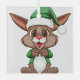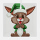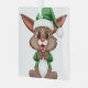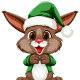 Ein Cartoon Kaninchen mit weißem Fell, großen Ohren und einem fröhlichen Ausdruck. Es trägt ein grünes Weihnachtsmotiv und einen passenden grünen Hut mit weißem Motiv. Das Kaninchen hat ein weißes Pflaster auf der Brust und eine rosa Nase, der Hintergrund ist schlicht weiß.