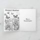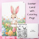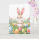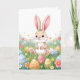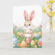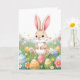 Personalisierter Cartoon Osterhasen Osterkarte mit einer Innenfarbenseite. Niedlicher Hase im Gras mit rosa und blauen Blumen und Ostereiern.