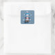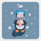 Blue square winter sticker featuring a cartoon penguin enjoying a cup of hot cocoa .