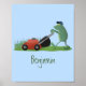 Ein lustiger grüner Frosch, der den Rasen im albernen Cartoon-Stil mäht.