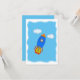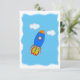 Benutzerdefinierte Grußkarte mit Cartoon-Rakete und Wolken mit Zeitungspapier-Effekt auf blauem Hintergrund. Originelles Design. Bleiben Sie auf der Rückseite für handgeschriebene Nachrichten.