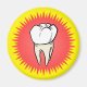 Mit diesem runden Magneten dekorieren Sie Ihren Kühlschrank mit einem lustigen, frisch gezogenen Molar auf einer roten Sternexplosion. Der Hintergrund ist gelb.