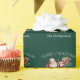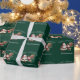 Dieses farbenprächtige, maßgeschneiderte Verpackungspapier besticht durch ein niedliches Winterurlaubsthema. In der Mitte ist eine Cartoon-Illustration von Santa Clause, Rudolph dem Rentier mit roter Nase und ein Schlitten voller Geschenke gedruckt. Imitate Gold Glitzer betont das Bild. Der Gruß Frohe Weihnachten wird über dem Cartoon mit einem Muster Familiennamen gedruckt unten. Der Hintergrund ist eine waldgrüne Farbe.