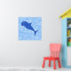 Ein blauer Cartoon Hai auf einem hellblauen, welligen Hintergrund.