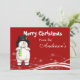Funny aussehender Cartoon Frosty the Snowman auf einem roten, schneebedeckten Hintergrund. Sehr niedlich und lustig Weihnachten Gruß Karte Einladung.