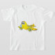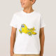 Ein skurril gelbes Cartoon Passagierflugzeug mit blauer Nase, das den freundlichen Himmel fliegt.