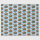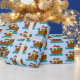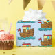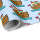 Ein Cartoon-Schleppboot mit braunem Holzboden und -tür, eine cremefarbene Kabine mit rotem Dach und einem blauen runden Fenster und eine rote Fahne auf der Rückseite, die auf den blauen Ozeanwellen segelt.