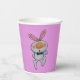 Diese Papiertassen sind hellrosa mit einem Cartoon-Hasen mit einer großen orangefarbenen Nase und einem Vorder- und Rückseite mit Daumenschild.