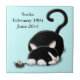 Cartoon eines Schwarzweiss-Kitty, der mit ihm schlafend ist, ist Spielzeugmaus. Spaß und sicher, ein Lächeln zu holen, wann immer Sie es sehen. Kundengerechte Text- und Hintergrundfarbe.