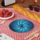 Ein monochromes Fraktal, das an eine aufwändige Schnitzerei eines multibewaffneten oder mehrflügeligen Sterns in blauem Metall oder Plastik erinnert. Passen Sie Ihren eigenen Text an.