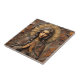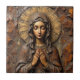"This striking design presents a portrait of the Virgin Mary as a detailed wood carving or relief sculpture, rendered in rich, warm brown and reddish-brown tones. She is depicted with a tranquil, contemplative expression, hands clasped in prayer, and is framed by a rustic, textured halo. The rough, earthy texture of the wood grain provides a powerful sense of ancient, grounded spirituality. This design is highly suitable for products with a rustic, spiritual, or devotional theme. Imagine it on wooden plaques, religious art prints, handcrafted items, or home decor that evokes a traditional, artisan aesthetic."