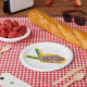 Carving etwas Fleisch bereit zu essen. Dieses Design wirkt auf diese Paper-Teller sehr effektiv