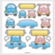 Set waschen. Brush, Wasserspritze, blauer Cartoon, Schweine- und Seifenblasen.