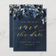 Eine marineblaue Hochzeit Save The Date-Karte mit marinebündigen Ponys, die inmitten staubiger, silberblauer Vegetation auf einem dunklen marinebasierten Aquarellhintergrund mit einem atemberaubenden Schriftart-Sprichwort aus Swash-Kalligraphie "Save the Date" in einem glänzenden Goldschrift kaskadieren.