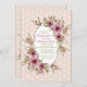 This fawn-colored background, with white polka dots, has an oval panel adorned with fantasy flowers and foliage. Featured as a confirmation invitation, it is well-suited for any feminine celebration.