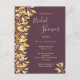 Eine trendige botanische Brautdusche in Cassis, tief lila. Dekoriert mit goldfarbenem Blattwerk und Imitaten. Moderne Großschrift, Typografie mit dem Text: Brautparty. Vorlagen für den Namen der Braut und die Einzelheiten des Party. Goldener Text. Zurück: kaskadenfarbener Hintergrund. Tipp: Wenn Sie es nicht so gewollt haben, dass es wie eine Postkarte aussieht, klicken Sie auf Anpassen, gehen Sie auf die Rückseite und entfernen Sie den Trenner und posten Sie die Briefmarke.
