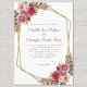Chic Cassis, elegante und formelle Hochzeitseinladung mit romantischer, blumengeschmückter Wasserfarbe, die mit grünem Grün auf einem knackigen, klassischen weißen Hintergrund dargestellt wird. Ein glänzender, goldfarbener, geometrischer Kristallrahmen sorgt für eine trendige Touch. Traditionelle, klassische Formulierungen sorgen für zeitlose Eleganz. Personalisieren Sie das Hochzeitsdesign mit Ihren Details in eleganter Cassis lila Schrift und Schrift. Die Rückseite der Einladung ist passend solide Fall lila, vervollständigt das Design.
