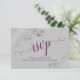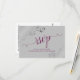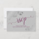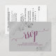 Diese wunderschönen RSVP-Karten machen es Ihren Gästen leicht, auf Ihre Hochzeitseinladung zu reagieren. Sie zeichnen sich durch ein elegantes Design aus, das mit lila oder magentafarbener Schriftzeichen-Kalligraphie auf grauem Hintergrund und silber-grauen Imitaten-Folienrollen und Wirbel in den Ecken ausgestattet ist. Auf der Rückseite der Karte können Ihre Gäste ausfüllen und zurückkommen, indem sie angeben, ob sie teilnehmen können oder nicht, die Anzahl der Gäste, die sie mitbringen, und ihre Wahl der Mahlzeiten. Es gibt auch Platz für eine Website, damit Ihre Gäste online antworten können, wenn es für sie bequemer ist.