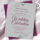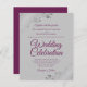 Diese preiswerten und freundlichen Einladungen für Hochzeiten sind die perfekte Wahl für Klasse, Stil und Schönheit zu einem günstigen Preis. Das Design umfasst lila, magentafarbene oder berry gefärbte Texte auf grauem Hintergrund mit verzierten silbernen Imitat-Folienkurven und Wirbel in den Ecken. Die Typografie beinhaltet extravagante Schriftzeichen für einen Stil, der gleichzeitig einfach und elegant ist. Ein wunderbarer Weg, um Ihre Freunde und Familie einzuladen, sich an Ihrem besonderen Tag zu erfreuen, ohne die Bank zu brechen.