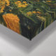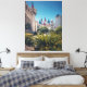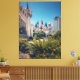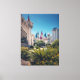 Ein Foto erfasst ein skurriles Las Vegas Schlosshotel, das seine farbenfrohen Türme und die faszinierenden Details zeigt. Das Bild ist aus einem niedrigen Winkel genommen und hebt einen üppigen Garten mit lebhaften gelben Blumen und Palmen im Vordergrund hervor. Die mit roten, blauen und weißen Akzenten geschmückten Türme des Schlosses erheben sich gegen einen klaren, blauen Himmel und schaffen so eine malerische Szene.
