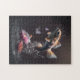 Mit diesem realistischen Puzzle einer Foto- und Fischmedley, das mit Wassertröpfchen, Blume und Schmetterlingen aus dem Wasser springt, stellen Sie sich die Herausforderung.