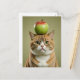 Eine lustige Katze mit einem Apfel, der auf seinem Kopf ausbalanciert.