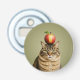 Eine lustige Katze mit einem Apfel, der auf seinem Kopf ausbalanciert.