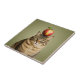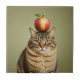 Eine lustige Katze mit einem Apfel, der auf seinem Kopf ausbalanciert.