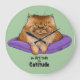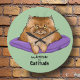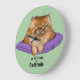 Eine orangefarbene Perserkatze auf einem königlich lila Kissen zeigt ihre Einstellung in grüner Umgebung