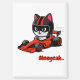 Die Herausforderung einer schwarz-weißen Katze, die ein Rennwagen Formel 1 manövriert, mit einem Helm auf dem Kopf.