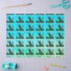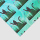 A black cat silhouette with dragonflies and cattail plants on a blue & green background.
