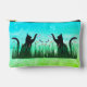 A black cat silhouette with dragonflies and cattail plants on a blue & green background.