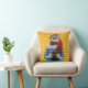 Mit dieser niedlichen und sonderbaren Kätzin können Sie jedem Zimmer eine Farbe hinzufügen. Dieses Kopfkissen zeigt eine Collage im Foto-Stil-Abbildung einer Katze, die in einem Retro-Pullover gekleidet und mit einer Vintagen Kamera versehen ist. Der Tabby in seinem roten Schal und seinem blauen Pullover ist Set an einer hellgelben Ziegelwand.