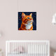 Illustriertes Kunstwerk einer orangefarbenen Katze mit grünen Augen und weißem Fell, umgeben von einem sternvollen kosmischen Hintergrund. Die Szene fängt ein Gefühl von Laune und Faszination ein.