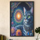 Eine majestätische Katze mit Schmuckstücken schmückt sanft unter einem strahlenden Sternenhimmel. Umgeben von faszinierenden Mustern, farbenfrohen Blume und einer verzierten Sonne, strahlt die Szene mit mystischem Charme und künstlerischer Brillanz aus. Whimsical Cat Gazing Under a Starry Sky um Mitternacht